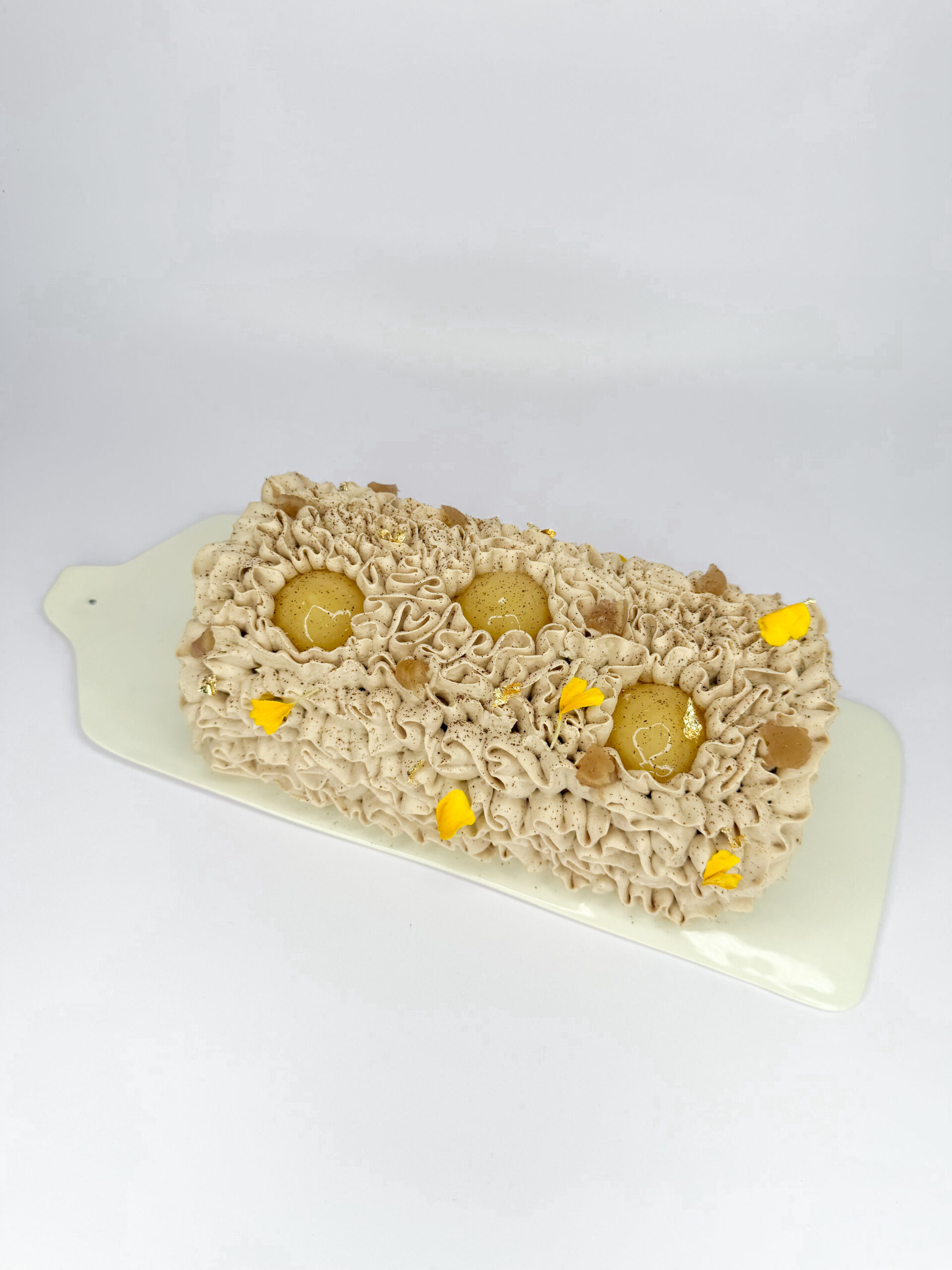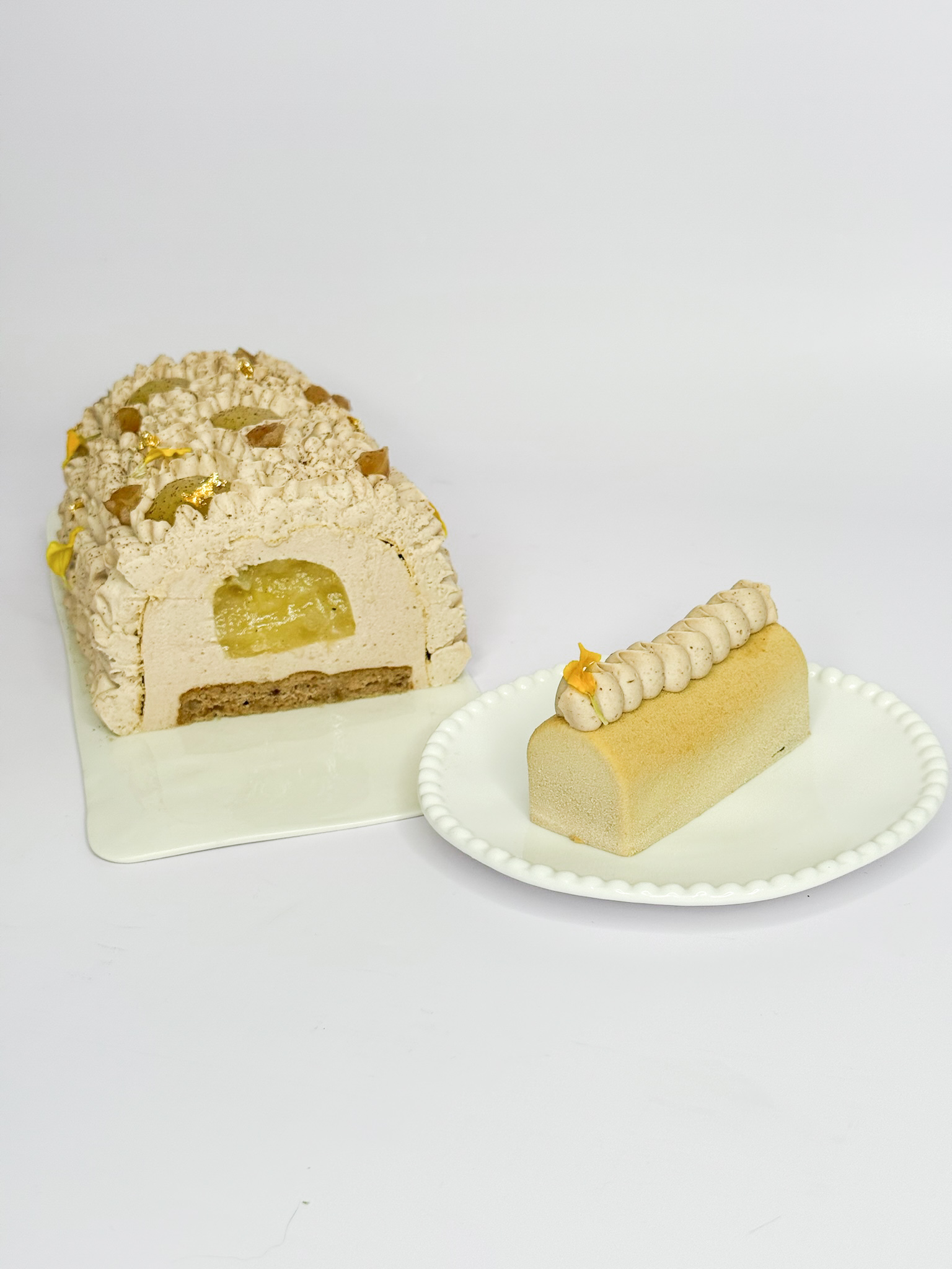 biscuit marron / éclats de marrons / insert confit de poire & morceaux de poires / mousse marron / ganache montée marron / dôme poire
