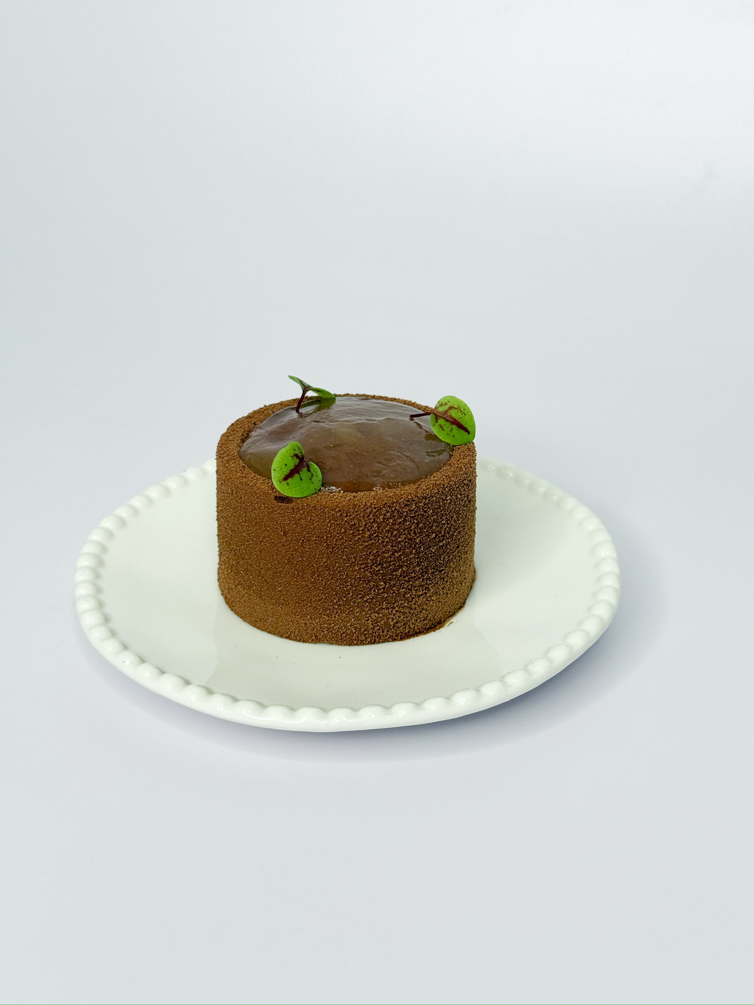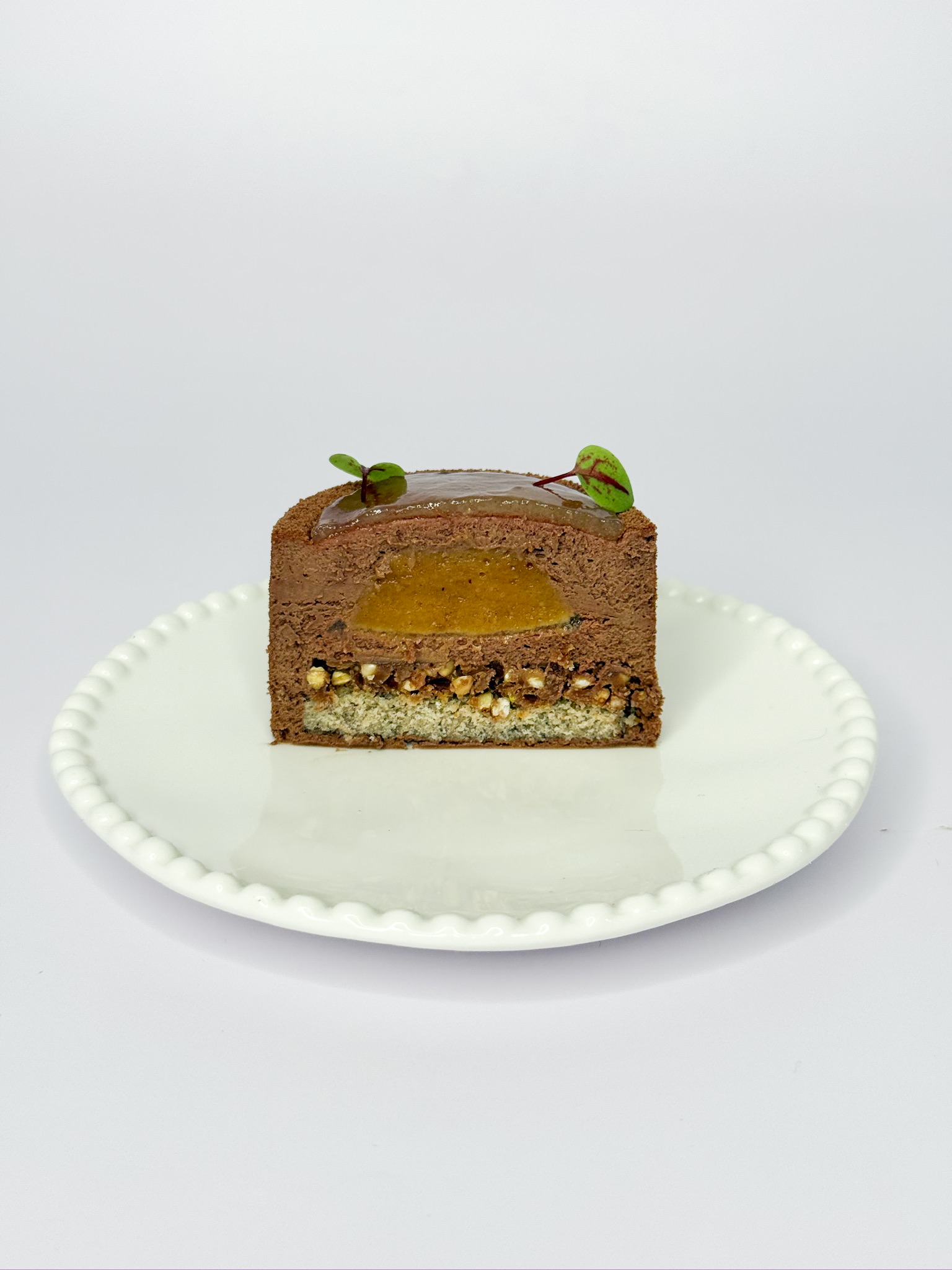 Biscuit sarrasin / croustillant sarrasin / insert praliné noisette maison / confit de bergamote / mousse au chocolat Araguani 72%