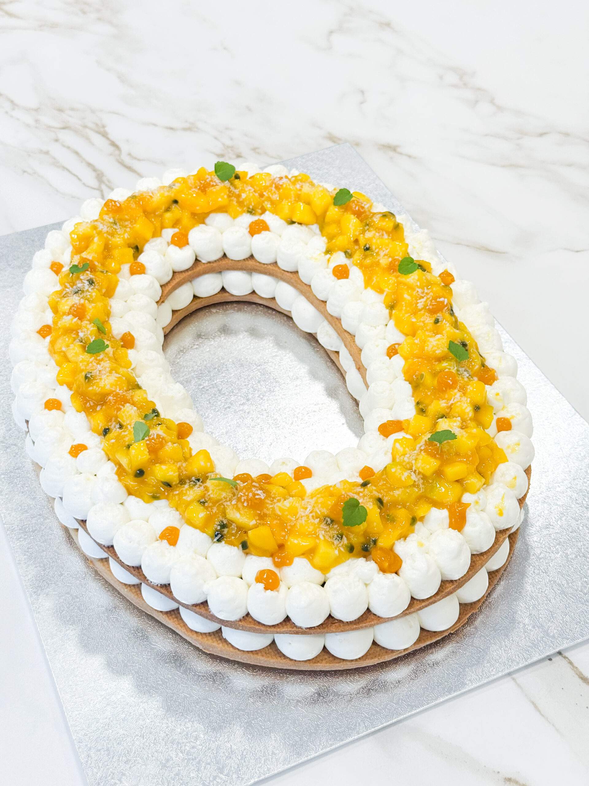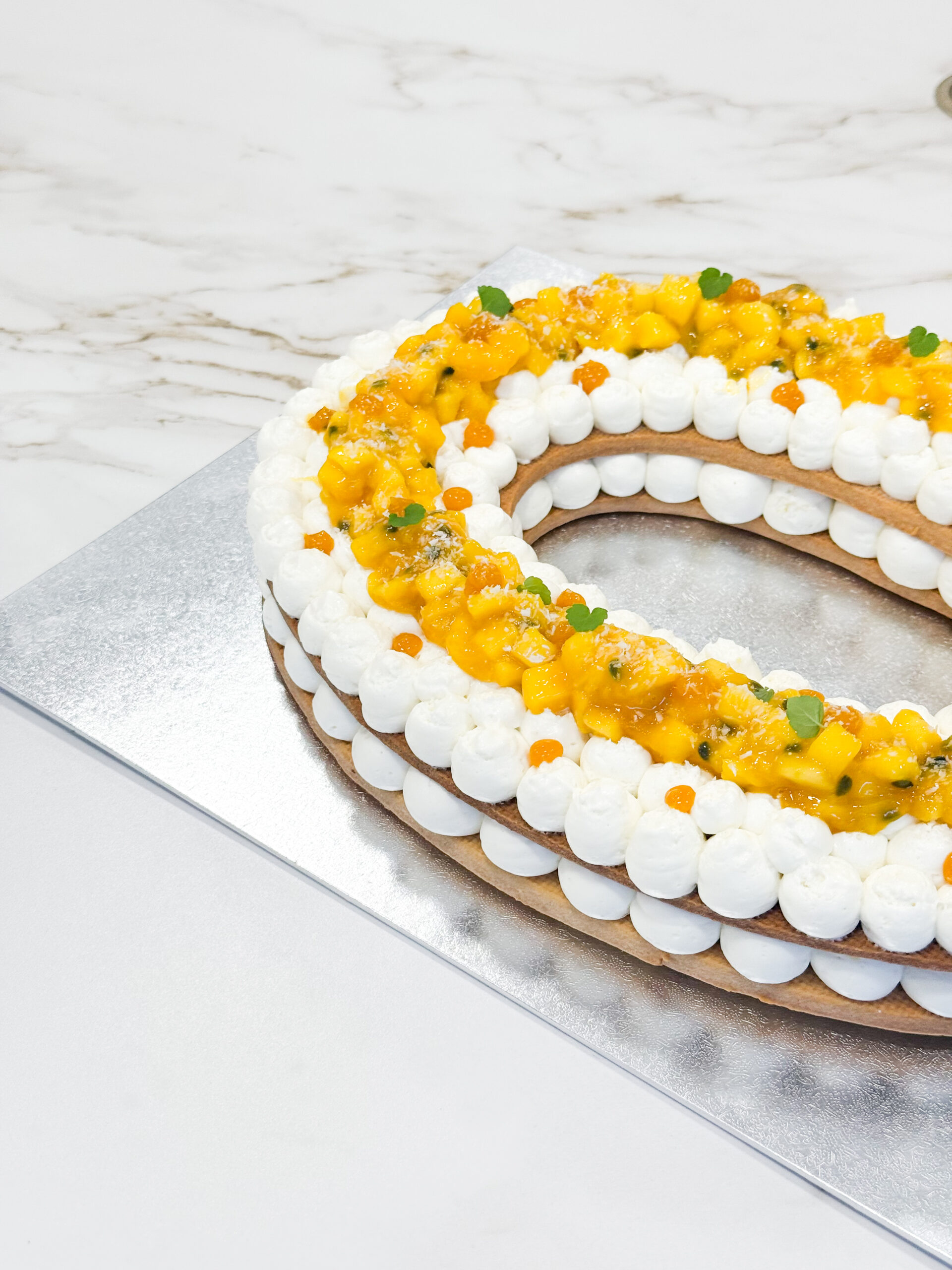 Pâte sucrée / ganache montée coco / insert crémeux passion et confit de mangue / décoration : mangue, fruit de la passion, framboise, coco râpée
