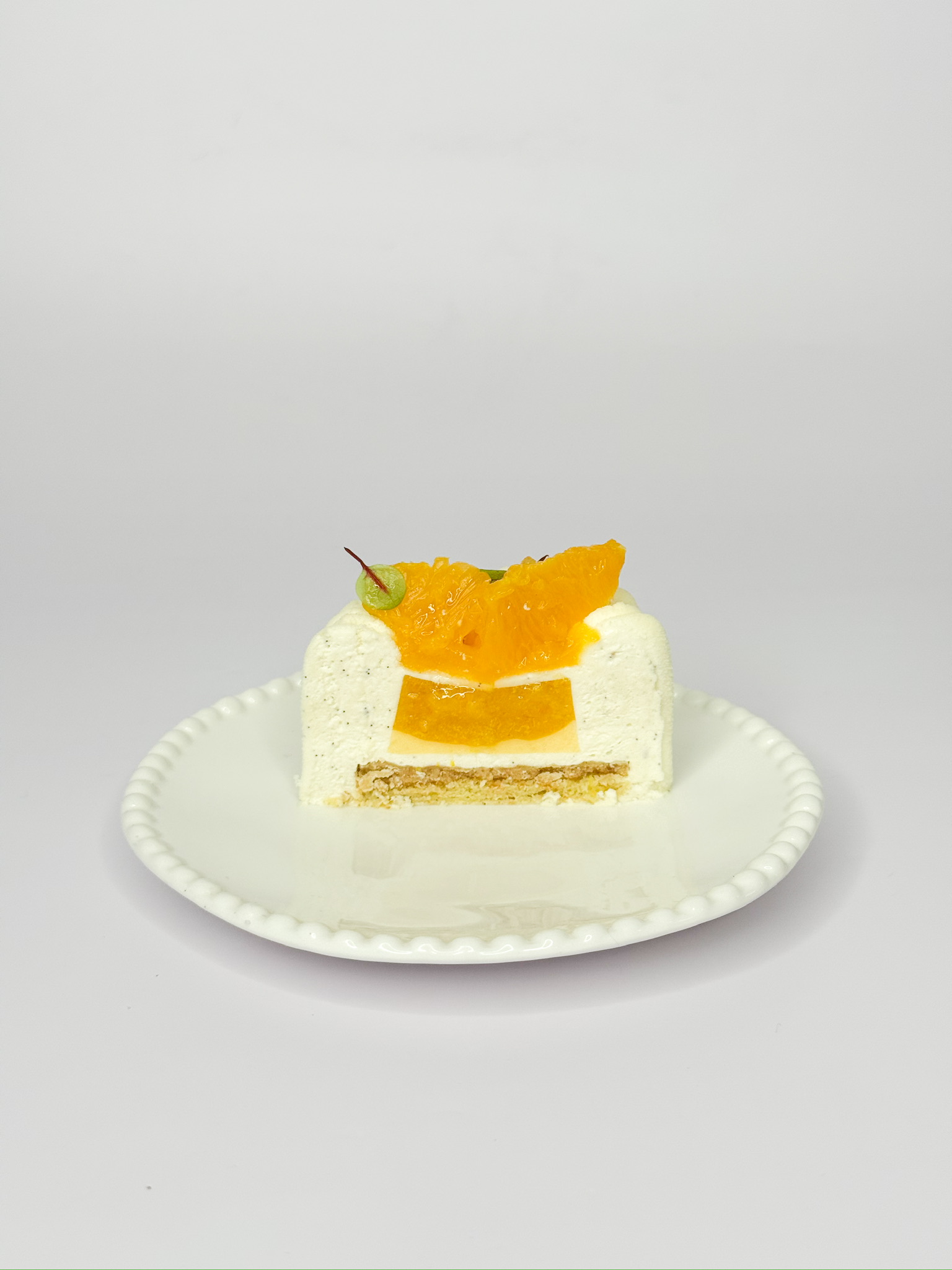 Biscuits aux zestes / croustillant crumble / insert confit de mandarine maison / insert crémeux mandarine / mousse vanille / gel mandarine et suprêmes d’orange