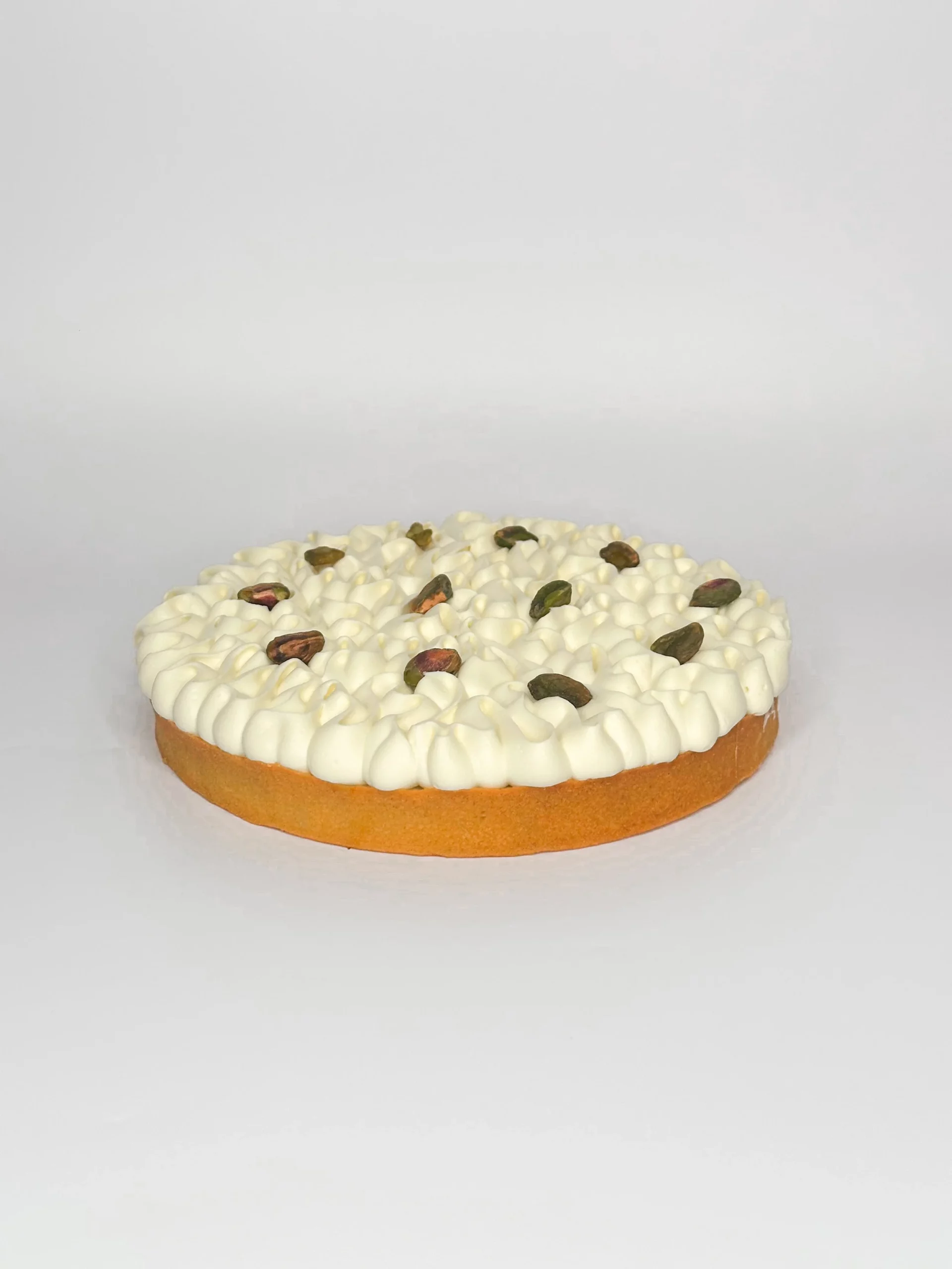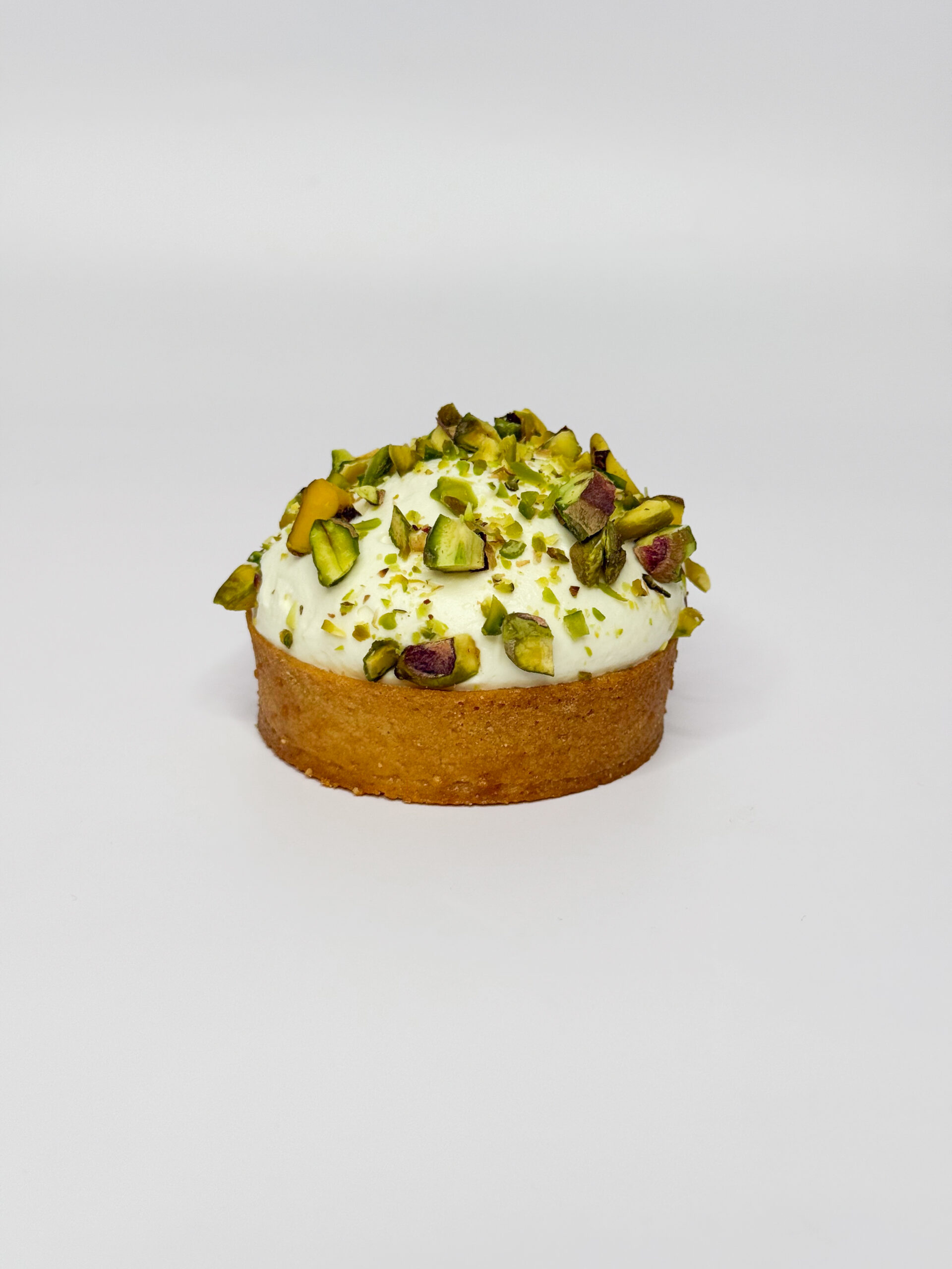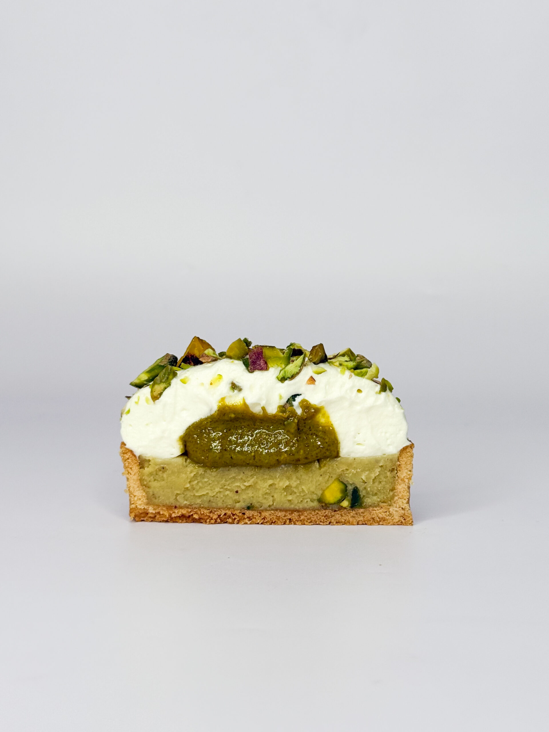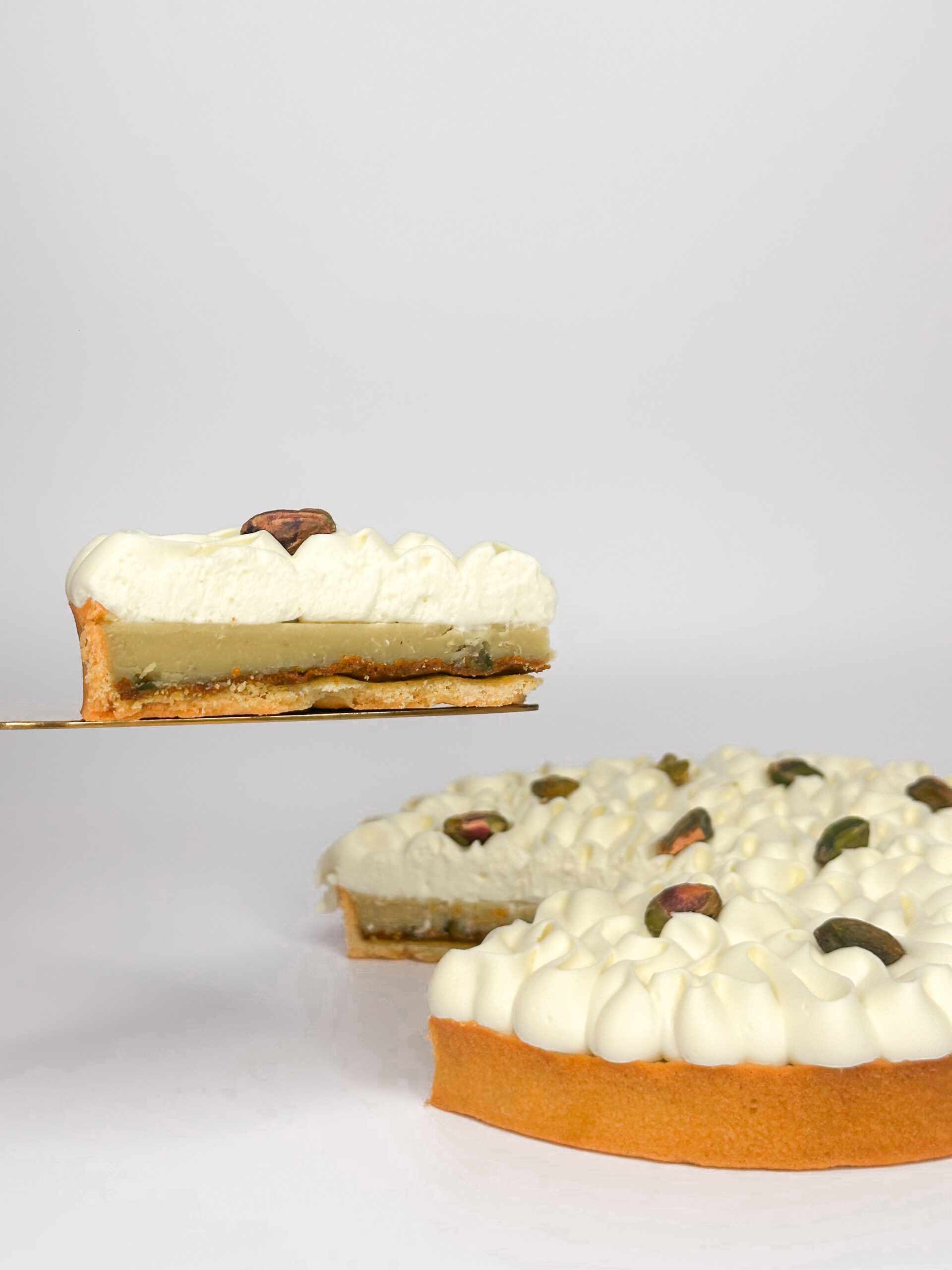 Pâte sucrée / éclats de pistaches / praliné pistache maison / ganache pistache / ganache montée fleur d’oranger