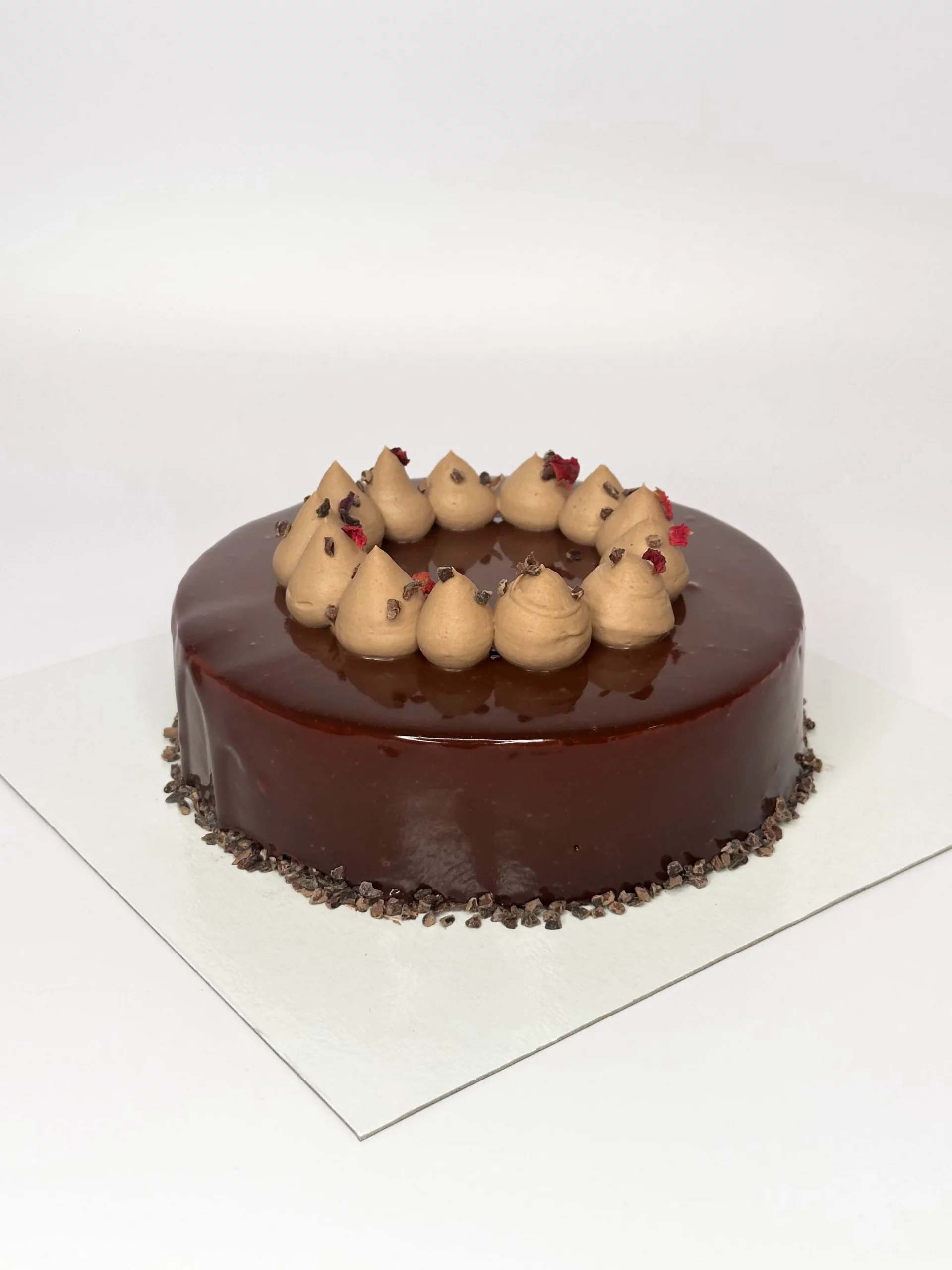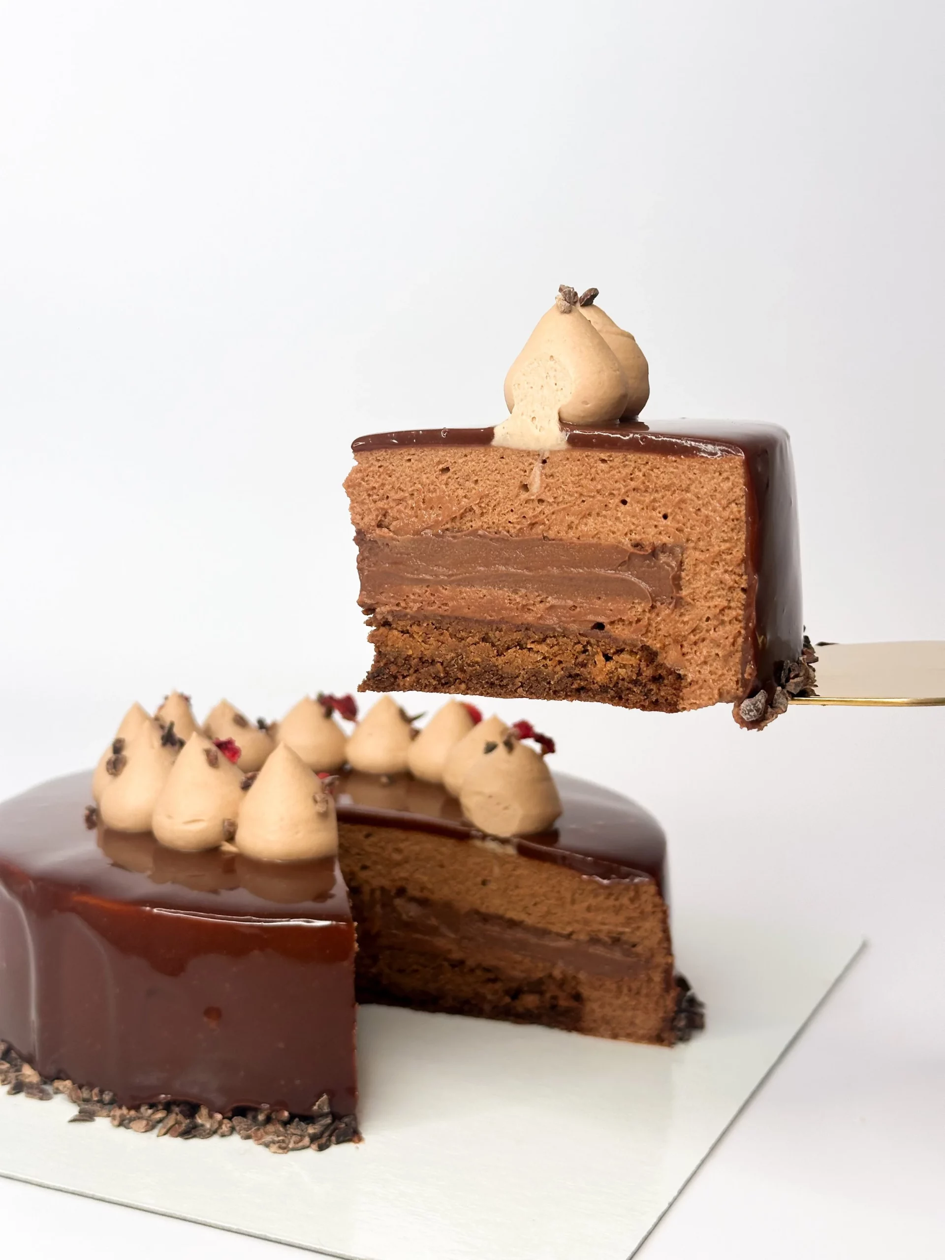 Biscuit sacher / croustillant praliné & streuzel / insert crémeux Alpaco 66% / mousse au chocolat Tanariva 33% / glaçage chocolat