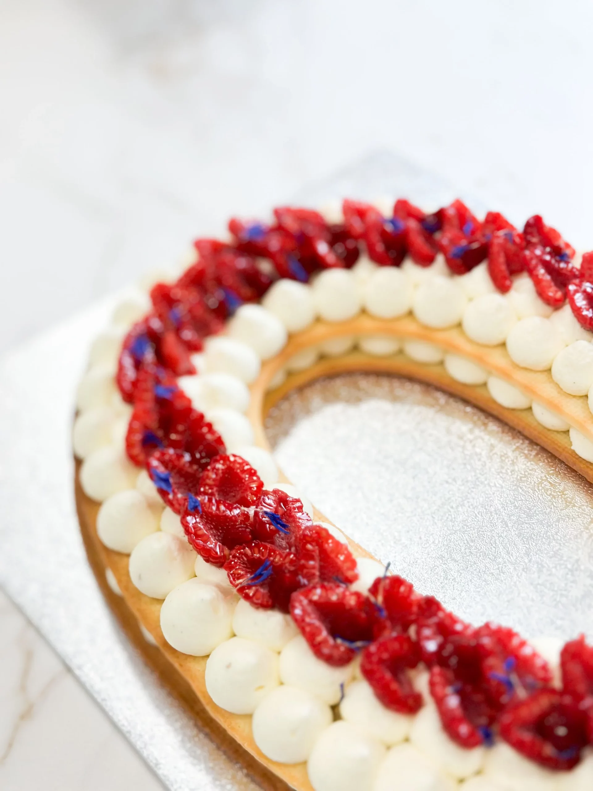 Pâte sucrée / diplomate vanille / insert confit de framboise / déco : framboise fraîches, pétales de bleuets